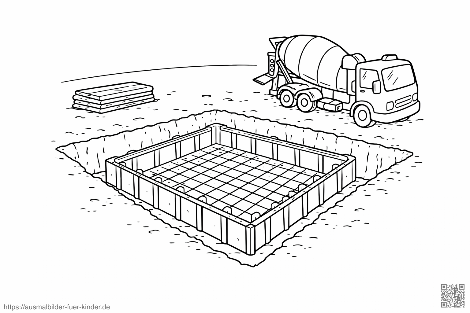 Ein großes Loch im Boden markiert den Anfang von etwas Neuem. Dieses baustelle ausmalbild erklärt auf einfache Weise, wie Hausbau startet: erst messen, dann graben, dann Fundament setzen. Die Szene bietet breite Flächen und klare Konturen, ideal für ruhiges Ausmalen. Rund um fundament und freigeräumtes grundstück lassen sich Erdtöne, Maschinenfarben und kleine Details kreativ kombinieren. Nebenbei verstehen Kinder Bauabläufe besser und trainieren dabei ihre Farbplanung.