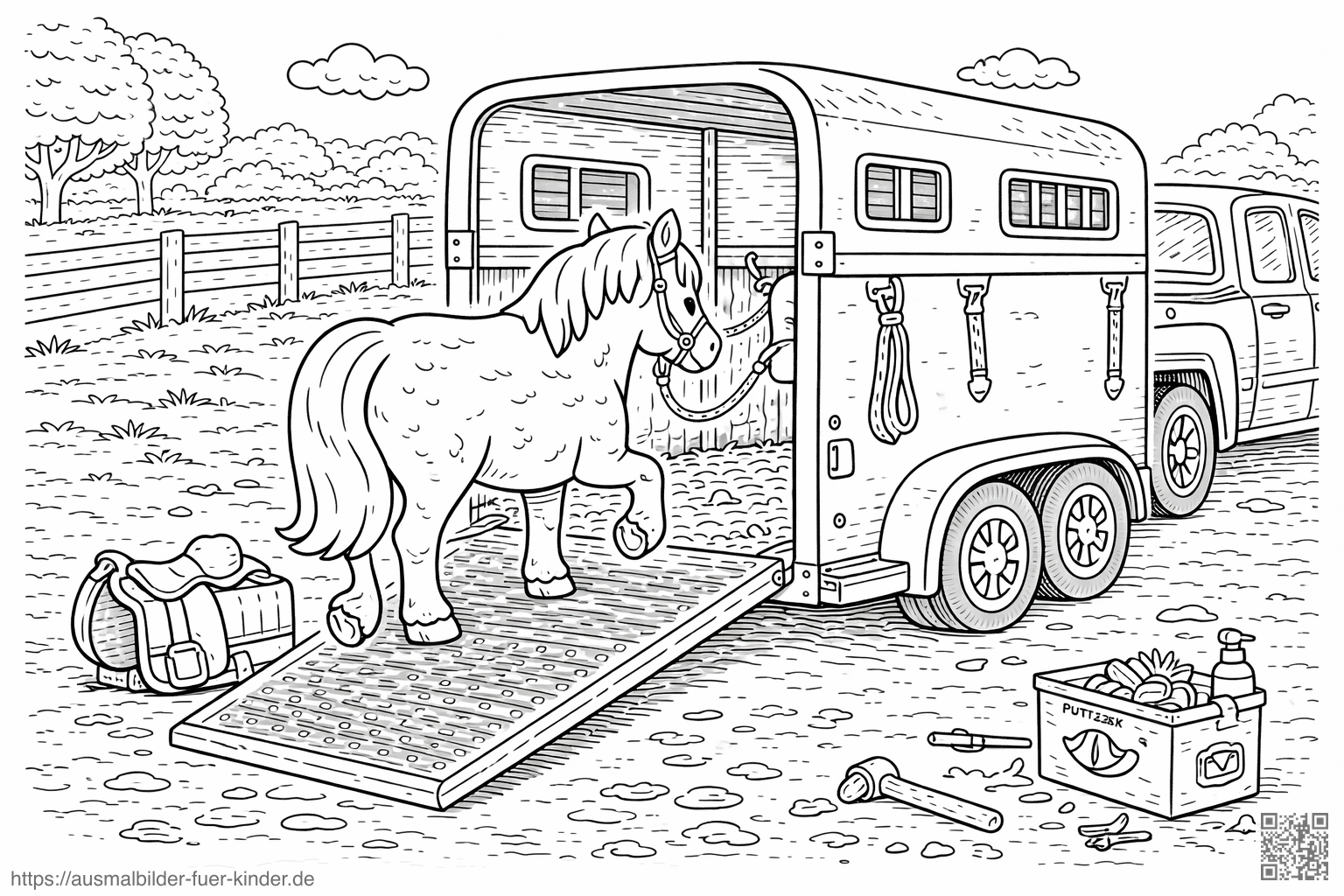 Behutsam wird das Pferd in den Anhänger geführt - ein ruhiger Moment rund um Transport und Vertrauen. Das Bild verbindet Tiernähe mit Alltagssituation und eignet sich gut, um Abläufe auf dem Hof kindgerecht zu zeigen. Kinder können Führstrick, Stallbereich und Fahrzeug unterschiedlich einfärben und eigene Details ergänzen. So entsteht eine realistische, aber freundliche Vorlage, die Konzentration und Fantasie gleichermaßen anspricht und Sicherheit vermittelt.