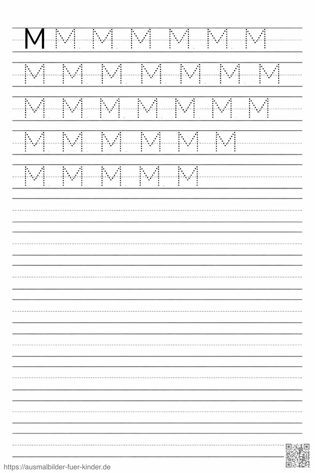 Mit diesem M-Arbeitsblatt üben Kinder die typischen Bögen und Spitzen des Buchstabens Schritt für Schritt. Die Kombination aus Spurvorlage, freien Zeilen und kleinen Ausmalfeldern sorgt für Abwechslung und hilft, die Form dauerhaft einzuprägen. Besonders für Vorschule und frühe Grundschule ist das Blatt gut geeignet. Mehr Alphabetmaterial gibt es in ABC lernen, weitere Druckseiten unter Lernen. Dadurch werden Sicherheit, Rhythmus und Genauigkeit beim Schreiben Schritt für Schritt aufgebaut.