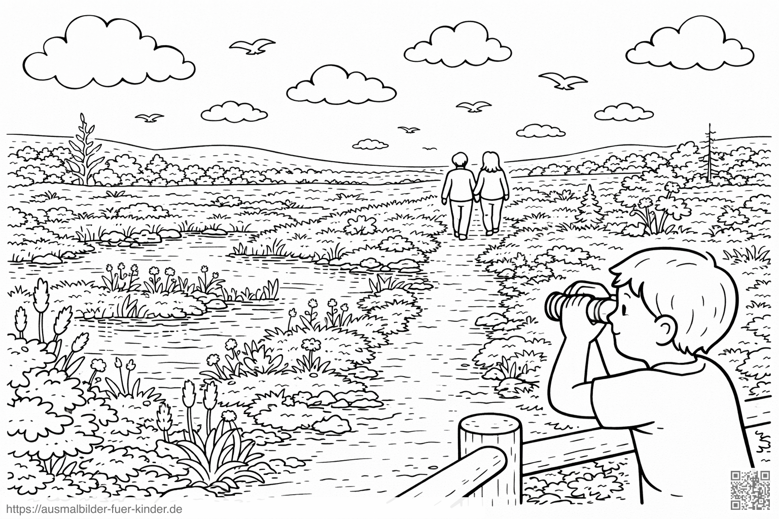 Ausmalbild mit Deutschland-Motiv: Familie im Moorland bei Tag. Ideal für Kinder, die Städte, Natur und Sehenswürdigkeiten entdecken möchten.