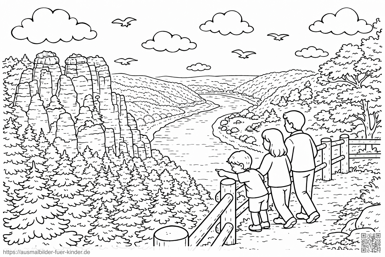 Ausmalbild mit Deutschland-Motiv: Familie im Nationalpark Sächsische Schweiz. Ideal für Kinder, die Städte, Natur und Sehenswürdigkeiten entdecken möchten.