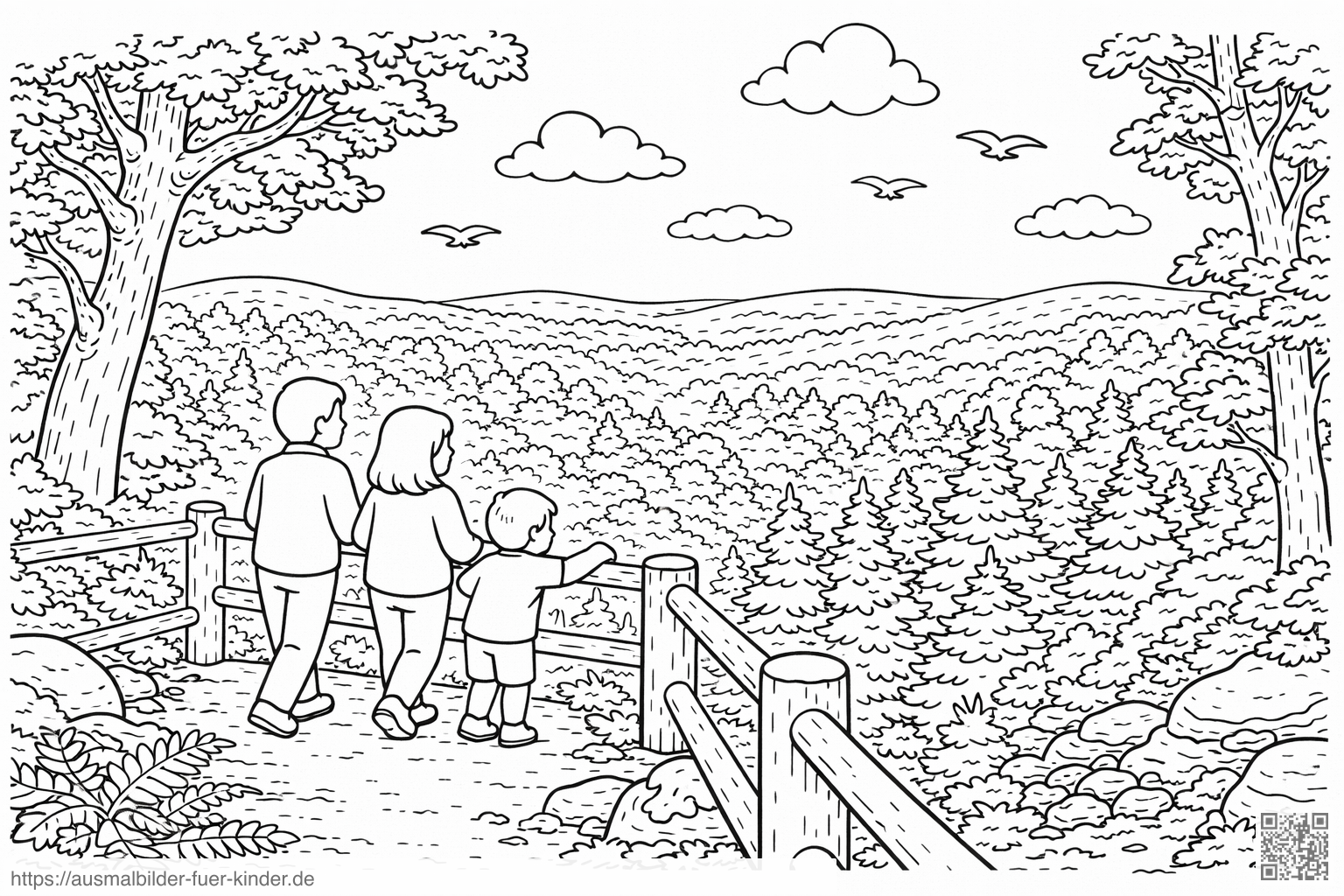 Im Teutoburger Wald wandert eine Familie zwischen hohen Bäumen und kleinen Lichtungen, sodass das Motiv gleichzeitig ruhig und lebendig wirkt. Die Malvorlage bietet breite Flächen für schnelle Erfolge und feine Konturen für detailverliebte Kinder. Wer Naturmotive mag, kann hier Blätter, Wege und Himmel farblich ganz frei gestalten. Dieses Deutschland-Bild passt ideal zu kreativen Nachmittagen mit viel Fantasie.