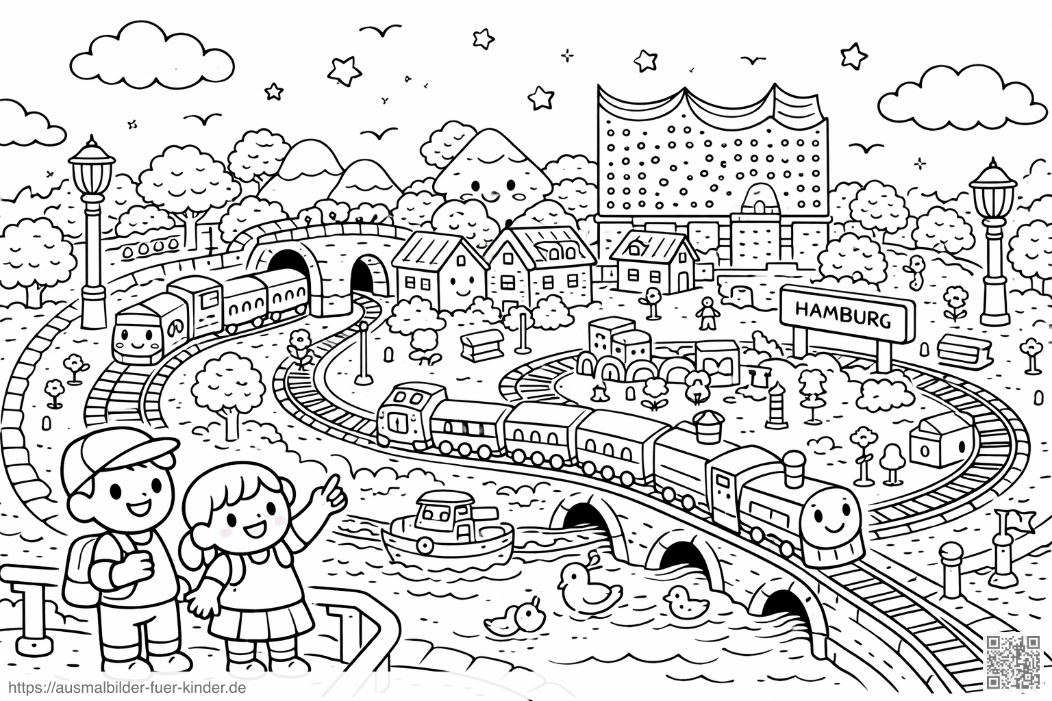 Wie eine kleine Spielzeugstadt wirkt diese Hamburger Miniaturwelt im niedlichen Stil. Das ausmalbild verbindet bekannte Orte mit kawaii-Elementen und macht so selbst Architektur kinderleicht zugänglich. Dächer, Wasserflächen und Figuren können in pastelligen oder kräftigen Paletten umgesetzt werden. Wer hamburg kreativ entdecken möchte, bekommt hier eine charmante Mischung aus Stadtmotiv und Fantasieillustration, die beim Ausmalen lange spannend bleibt. und Kindern einen spielerischen Zugang zu Stadtmotiven eröffnet.