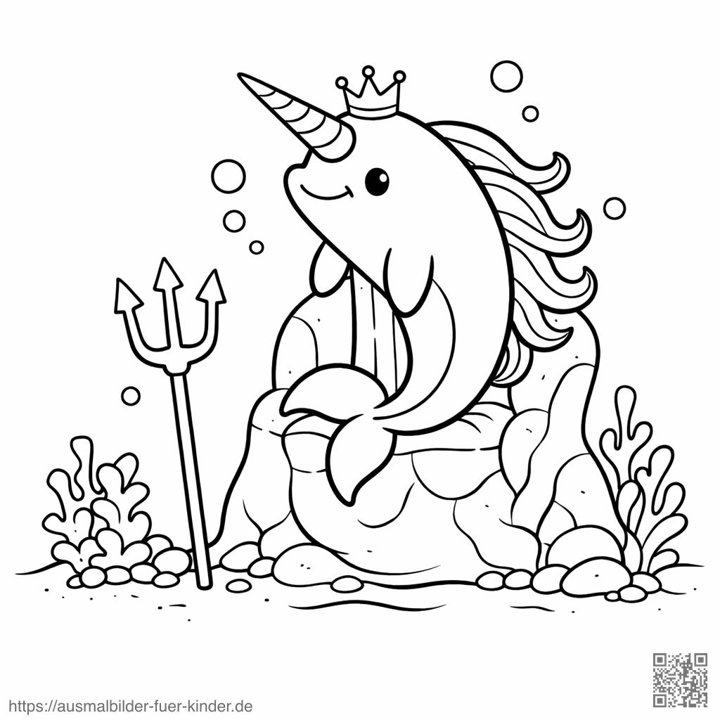 Mitten in einer schimmernden Wasserwelt sitzt ein unterwasser-einhorn auf einem majestätischen Felsenthron. Korallen, Blasen und Meerespflanzen schaffen eine fantasievolle Bühne für intensive Blau-, Lila- und Türkistöne. Das Motiv wirkt episch, bleibt aber dank klarer Konturen gut ausmalbar. Kinder können die Szene ruhig verträumt oder farbkräftig dramatisch gestalten. Gerade der erhöhte felsen-thron macht das Bild zu einem echten Blickfang im Malheft.