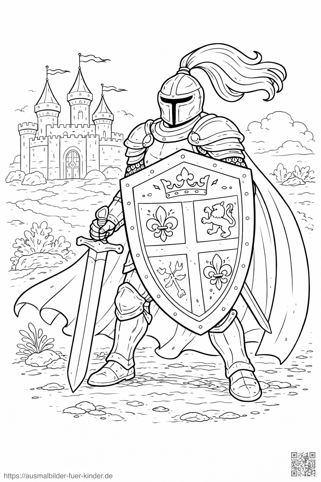 Standhaft vor dem Tor hält der Ritter seine Verteidigungsposition und beschützt das Schloss mit ruhiger Entschlossenheit. Diese Vorlage lebt von starken Konturen: Helm, Schild und Mauern sind deutlich erkennbar und gut auszumalen. Das Schloss-Motiv schafft eine märchenhafte Kulisse, die Kinder leicht erweitern können. So entsteht ein Bild zwischen Spannung und Ordnung, ideal für konzentriertes Malen mit vielen Farbvarianten. Zusätzlich vermittelt die Szene Schutz, Verantwortung und mittelalterliche Fantasie.