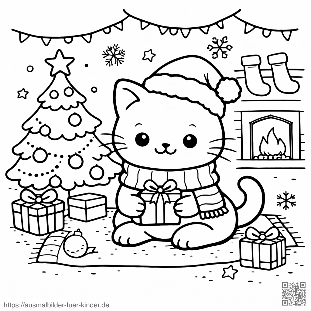 Ein schönes Ausmalbild: Katzen_Kätzchen im Weihnachtslook mit Geschenken