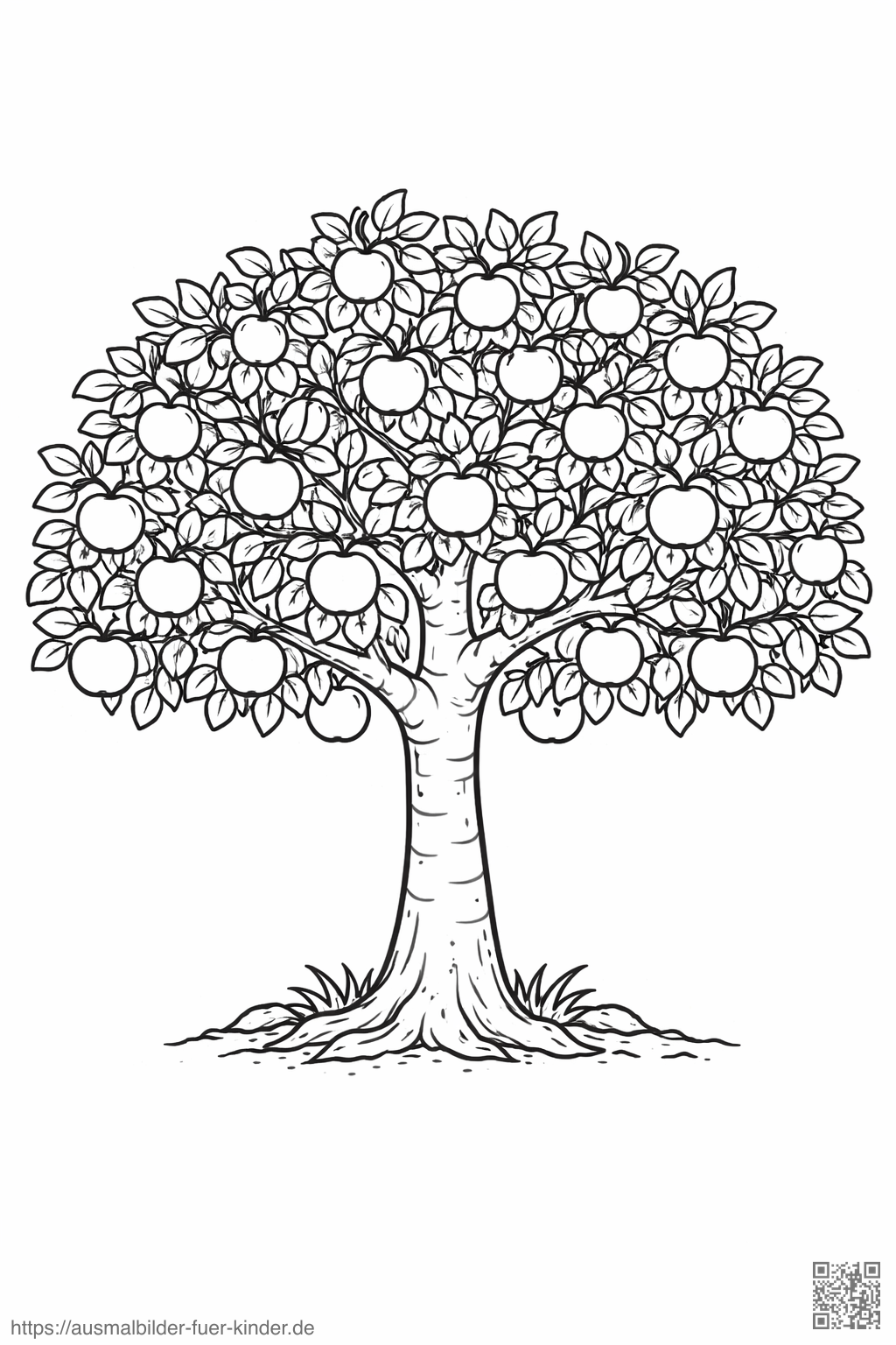 Reif beladen zeigt sich dieser Apfelbaum mit vielen Früchten und kräftiger Krone, perfekt für eine herbstliche Malstunde. Stamm, Blätter und Äpfel bieten abwechslungsreiche Flächen, auf denen Kinder natürliche oder ganz bunte Farbstimmungen ausprobieren können. Die Szene wirkt freundlich und geordnet. Als liebevolles Natur Ausmalbild vermittelt das Motiv Erntefreude und lädt zum entspannten Kreativsein im Familienalltag ein Auch Wiese und Himmel lassen sich fantasievoll ergänzen.