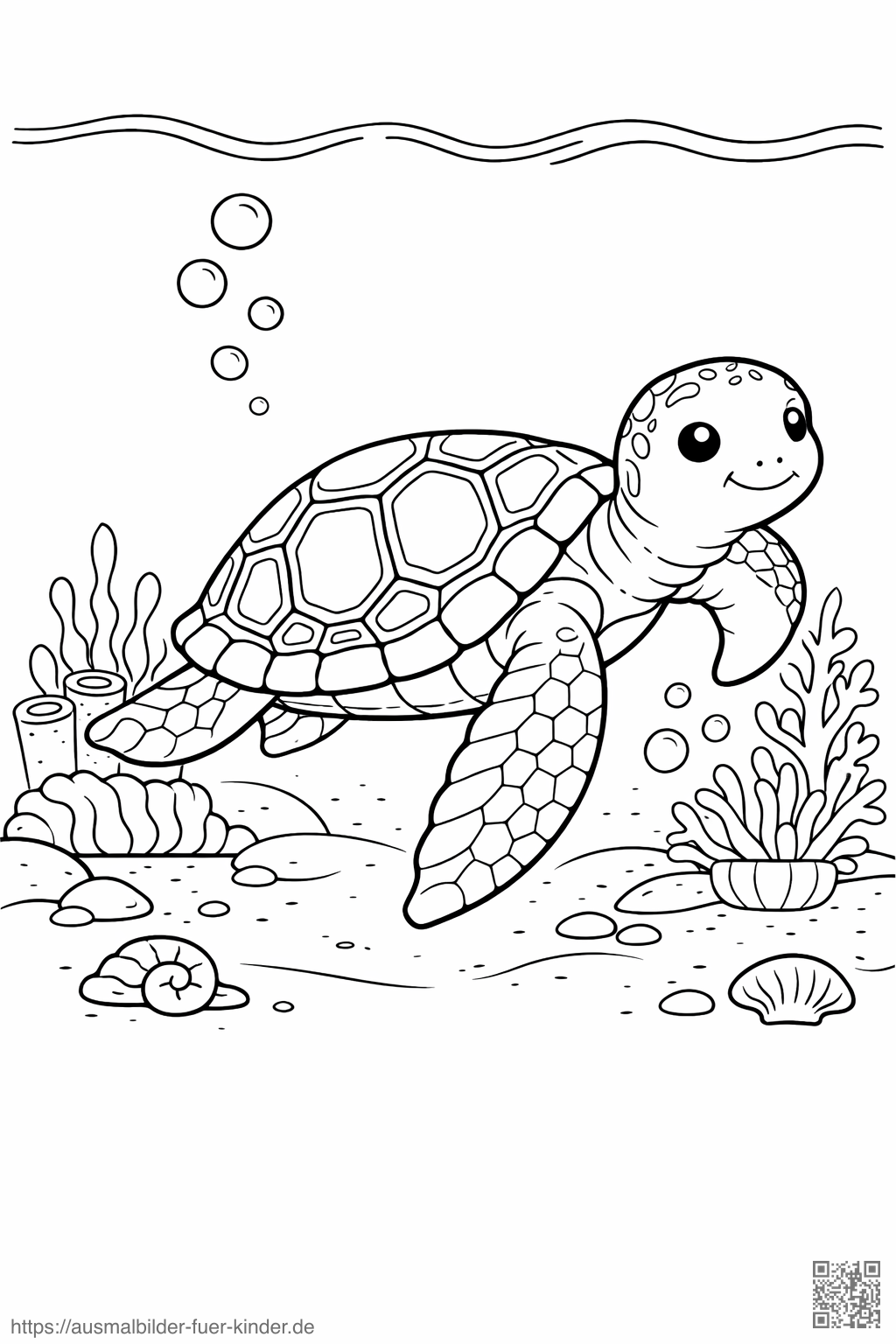 Mit weit ausgestreckten Flossen gleitet die Meeresschildkröte durch klares Wasser und wirkt dabei majestätisch und friedlich. Dieses Ausmalbild verbindet große Flächen mit feinen Panzerfeldern, sodass Einsteiger und geübte Kinder gleichermaßen Freude haben. Blasen, Lichtstreifen und kleine Fische geben dem Motiv Bewegung. Noch mehr Vorlagen rund ums Meer warten in Meerestiere, ideal für kreative Farbexperimente in Blau, Türkis und Grün Dabei lernen Kinder spielerisch, wie Muster, Licht und Wasser im Bild zusammenwirken können.